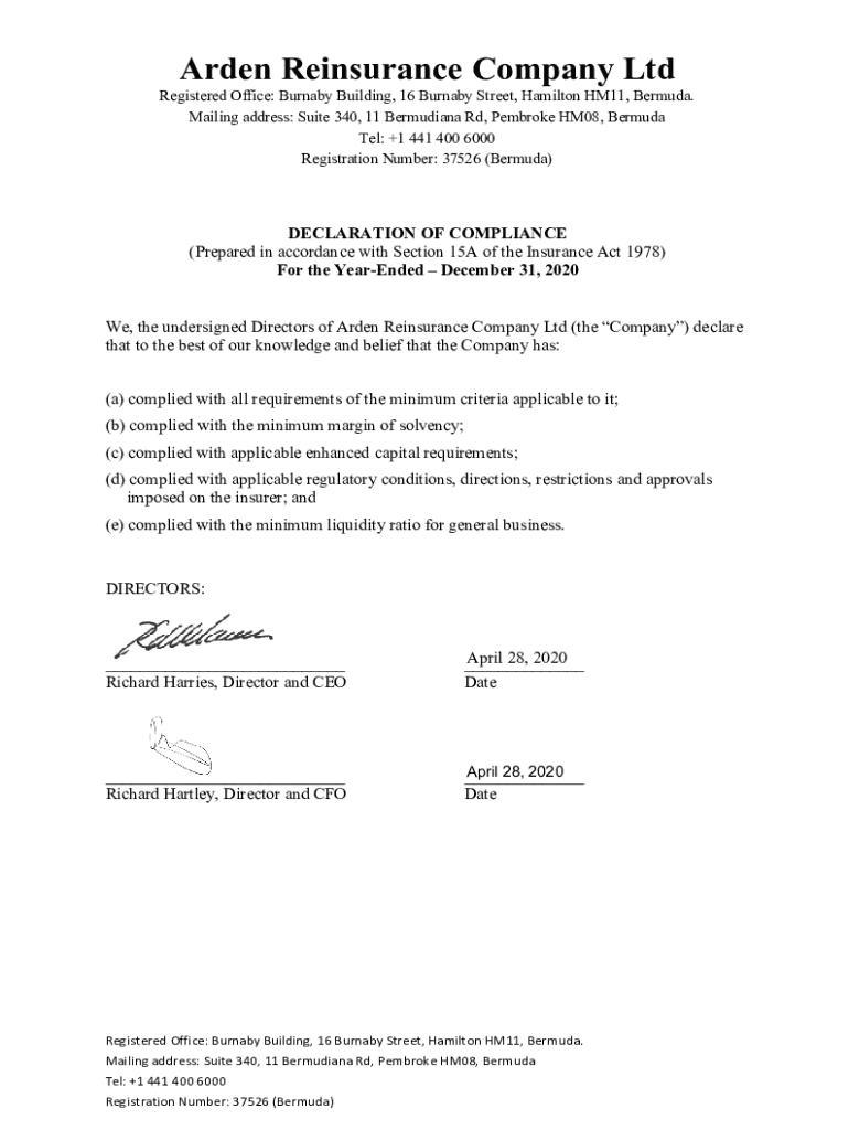 Arden Reinsurance Company Registered Office: Burnaby Building, 16 Burnaby Street, Hamilton HM11, Bermuda. Mailing address: Suite 340, 11 Bermudian Rd, Pembroke HM08, Bermuda Tel: +1 441 400 6000 Registration