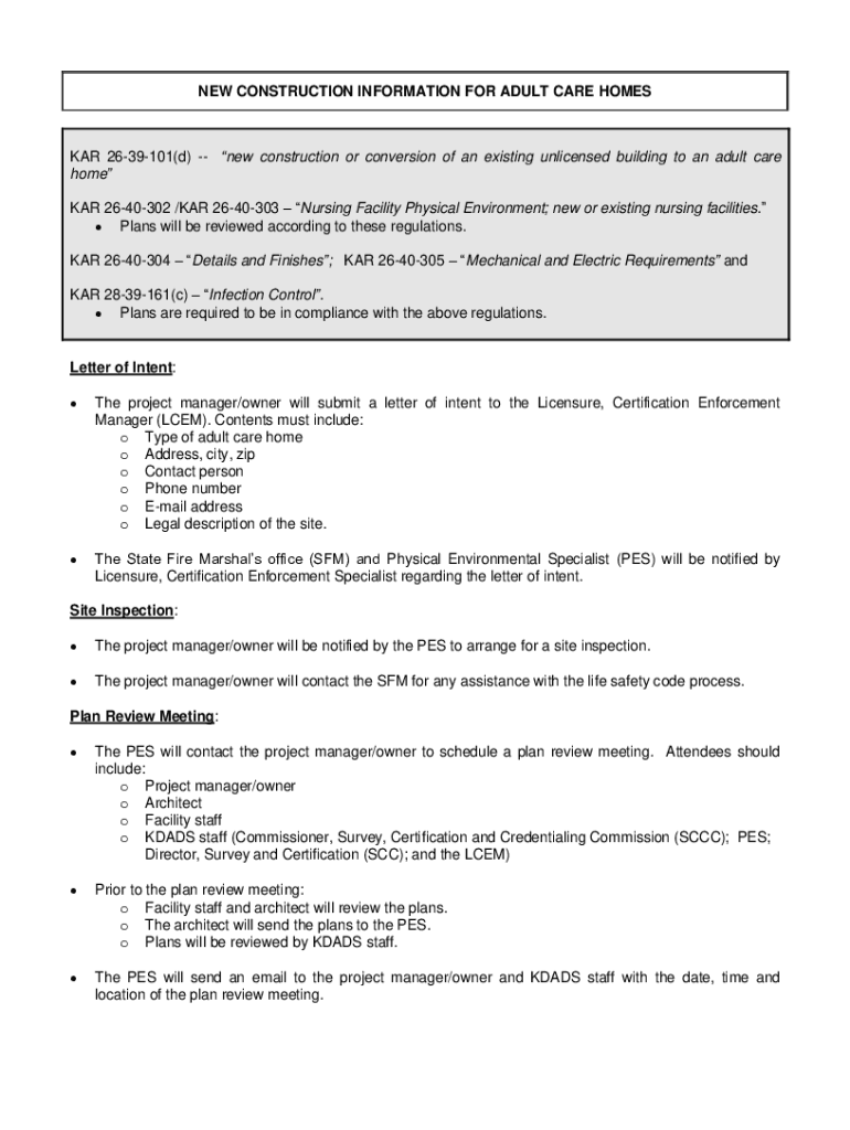 NEW CONSTRUCTION INFORMATION FOR ADULT CARE HomeSeer 2639101(d) new construction or conversion of an existing unlicensed building to an adult care home CAR 2640302 /CAR 2640303 Nursing Facility Physical