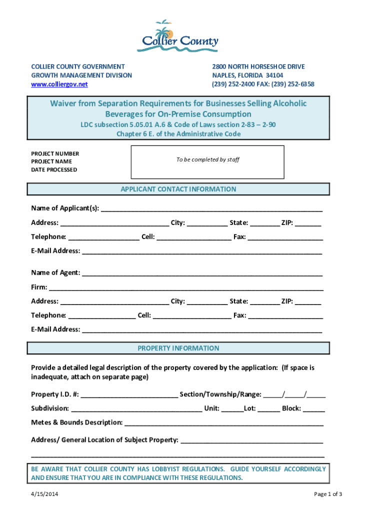 COLLIER COUNTY GOVERNMENT GROWTH MANAGEMENT DIVISION www.colliergov.net2800 NORTH HORSESHOE DRIVE NAPLES, FLORIDA 34104 (239) 2522400 FAX: (239) 2526358Waiver from Separation Requirements for Businesses