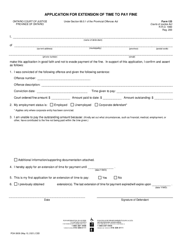 APPLICATION FOR EXTENSION OF TIME TO PAY FINE ONTARIO COURT OF JUSTICE PROVINCE OF ONTARIOUnder Section 66.0.1 of the Provincial Offenses Actor 125 Courts of Justice Act R.R.O. 1990 Reg. 200I, (name