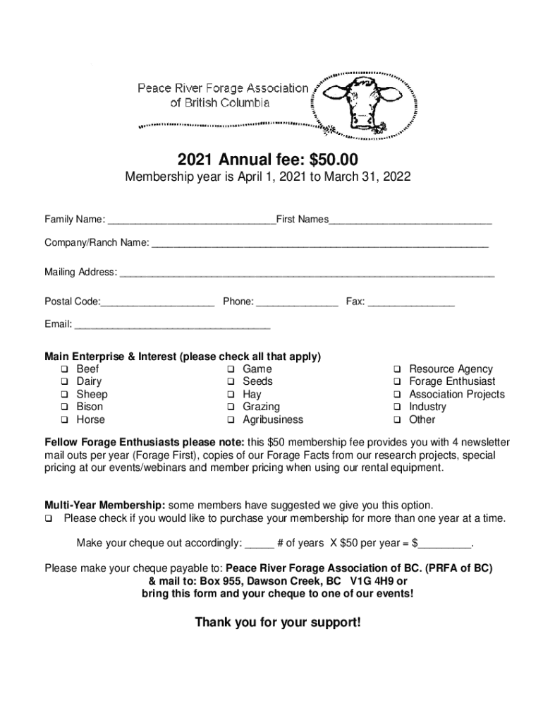 2021 Annual fee: $50.00 Membership year is April 1, 2021, to March 31, 2022, Family Name: First Names Company/Ranch Name: Mailing Address: Postal Code: Phone: Fax: Email: Main Enterprise & Interest