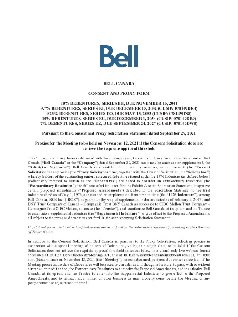 BELL CANADA CONSENT AND PROXY FORM 10% DEBENTURES, SERIES EH, DUE NOVEMBER 15, 2041 9.7% DEBENTURES, SERIES EX, DUE DECEMBER 15, 2032 (CUSP: 078149DK4) 9.25% DEBENTURES, SERIES EO, DUE MAY 15, 2053