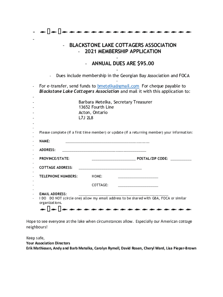 BLACKSTONE LAKE COTTAGERS ASSOCIATION 2021 MEMBERSHIP APPLICATION ANNUAL DUES ARE $95.00 Dues include membership in the Georgian Bay Association and FOCAL For transfer, send funds to bmetelka@gmail.com