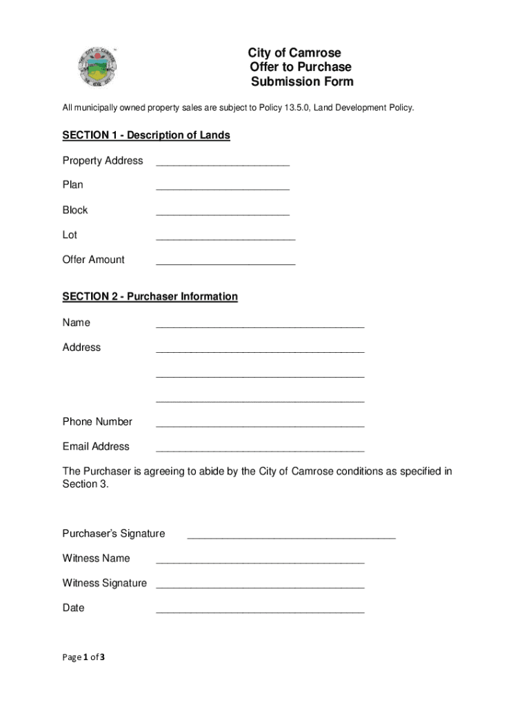 City of Cam rose Offer to Purchase Submission Form All municipally owned property sales are subject to Policy 13.5.0, Land Development Policy. SECTION 1 Description of Lands Property Address Plan