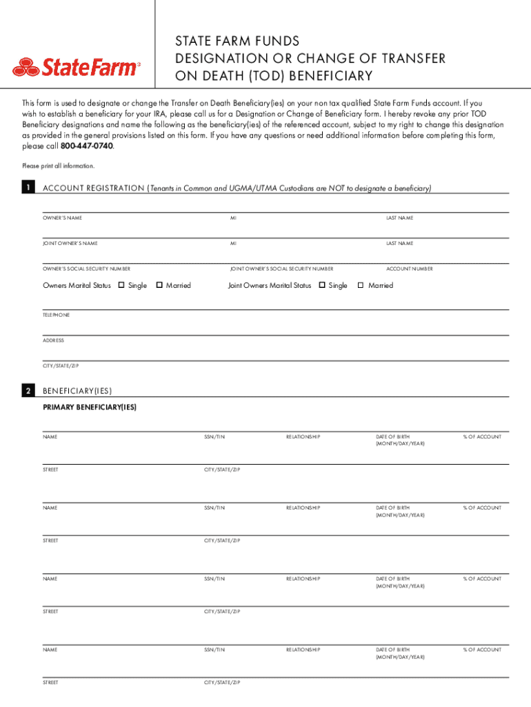 STATE FARM FUNDS DESIGNATION OR CHANGE OF TRANSFER ON DEATH (TOD) BENEFICIARY This form is used to designate or change the Transfer on Death Beneficiary(IES) on your non tax qualified State Farm Funds