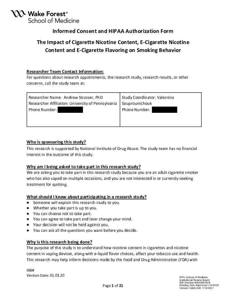 Informed Consent and HIPAA Authorization Form The Impact of Cigarette Nicotine Content, Cigarette Nicotine Content and Cigarette Flavoring on Smoking Behavior Researcher Team Contact Information:For