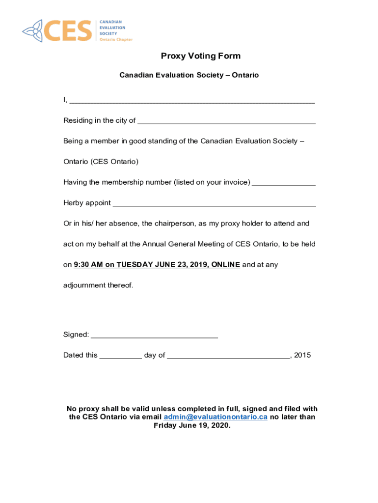 Proxy Voting Form Canadian Evaluation Society Ontario I, Residing in the city of Being a member in good standing of the Canadian Evaluation Society Ontario (CES Ontario) Having the membership number