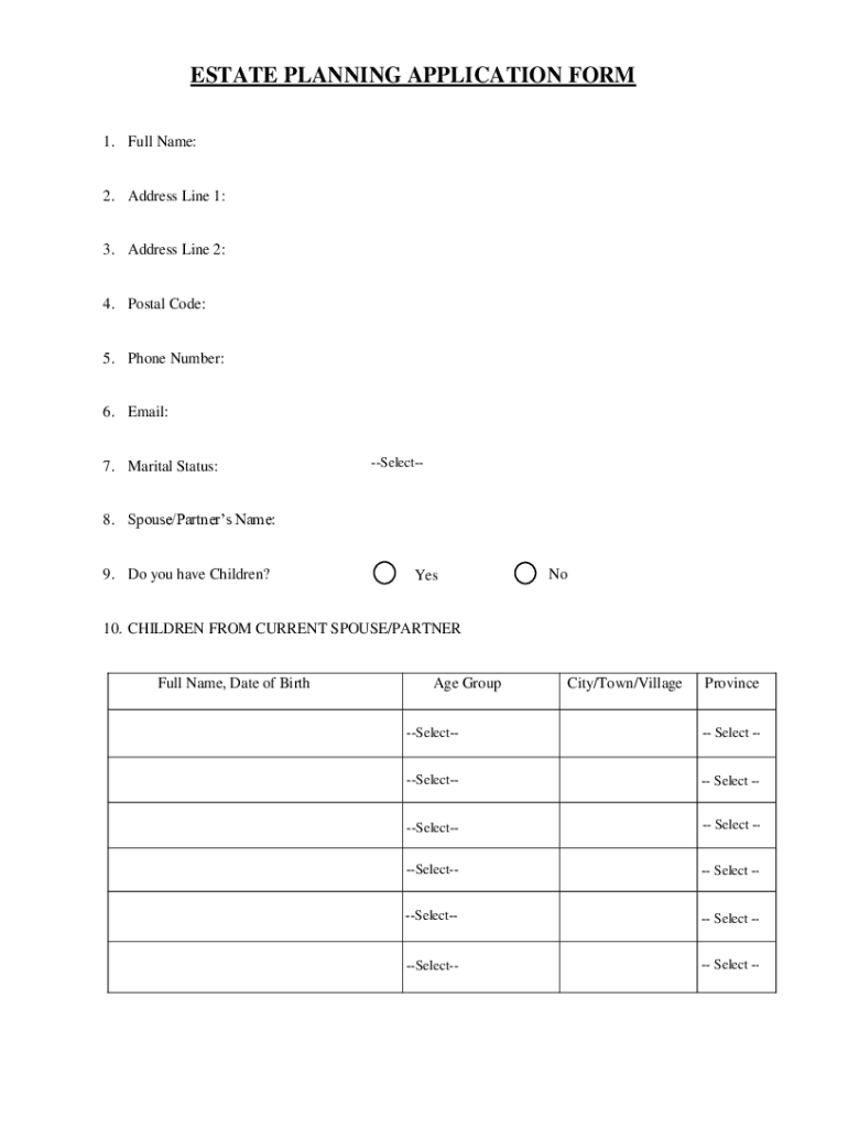 ESTATE PLANNING APPLICATION FORM 1. Full Name:2. Address Line 1:3. Address Line 2:4. Postal Code:5. Phone Number:6. Email:7. Marital Status:Select8. Spouse/Partners Name:9. Do you have Children? YesNo10.