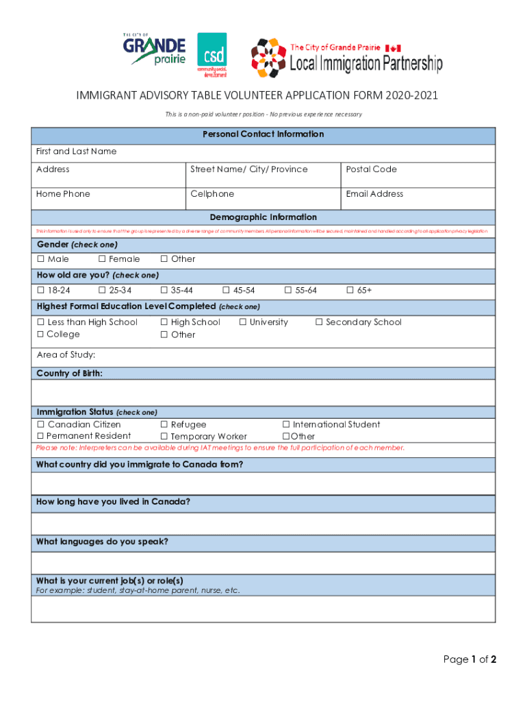 IMMIGRANT ADVISORY TABLE VOLUNTEER APPLICATION FORM 20202021 This is a nonpaid volunteer position No previous experience necessaryPersonal Contact Information First and Last Name AddressStreet Name/