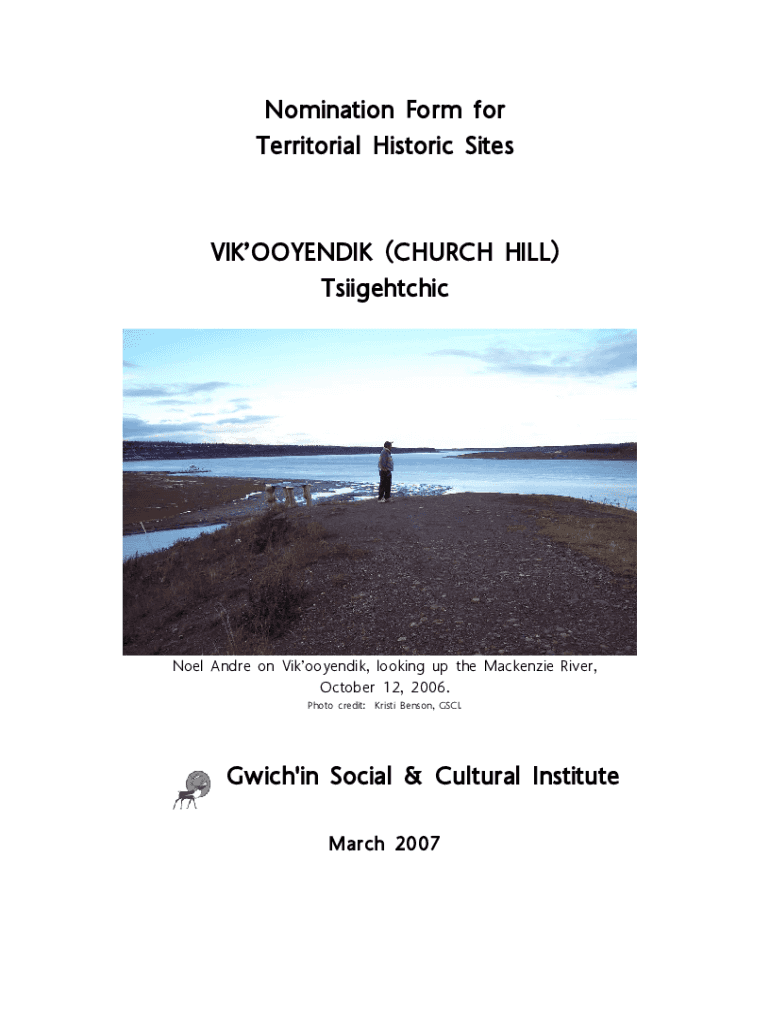 Nomination Form for Territorial Historic SitesVIKOOYENDIK (CHURCH HILL) TsiigehtchicNoel Andre on Vikooyendik, looking up the Mackenzie River, October 12, 2006. Photo credit: Kristi Benson, SCI. With
