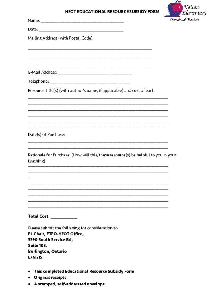 HEAT EDUCATIONAL RESOURCE SUBSIDY FORM Name: Date: Mailing Address (with Postal Code): Email Address: Telephone: Resource title(s) (with author's name, if applicable) and cost of each: Date(s) of