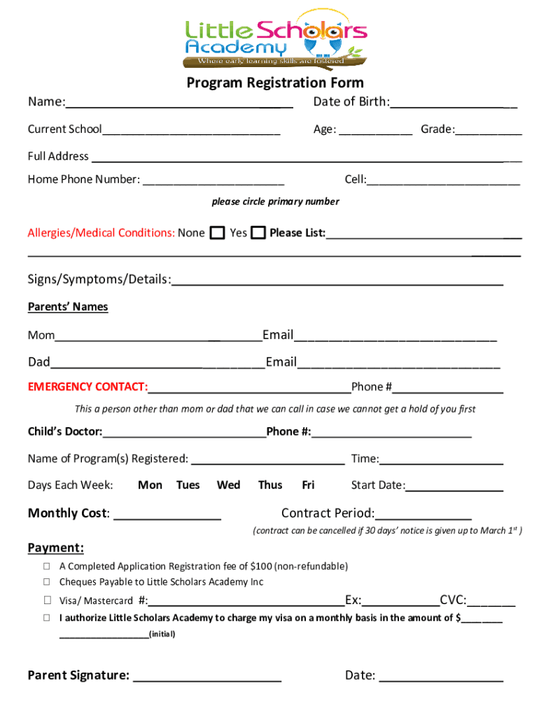 Program Registration Form Name: Date of Birth:Current School Age: Grade: Full Address Home Phone Number: Cell: please circle primary numberAllergies/Medical Conditions: NoneYesPlease List: Signs/Symptoms/Details: