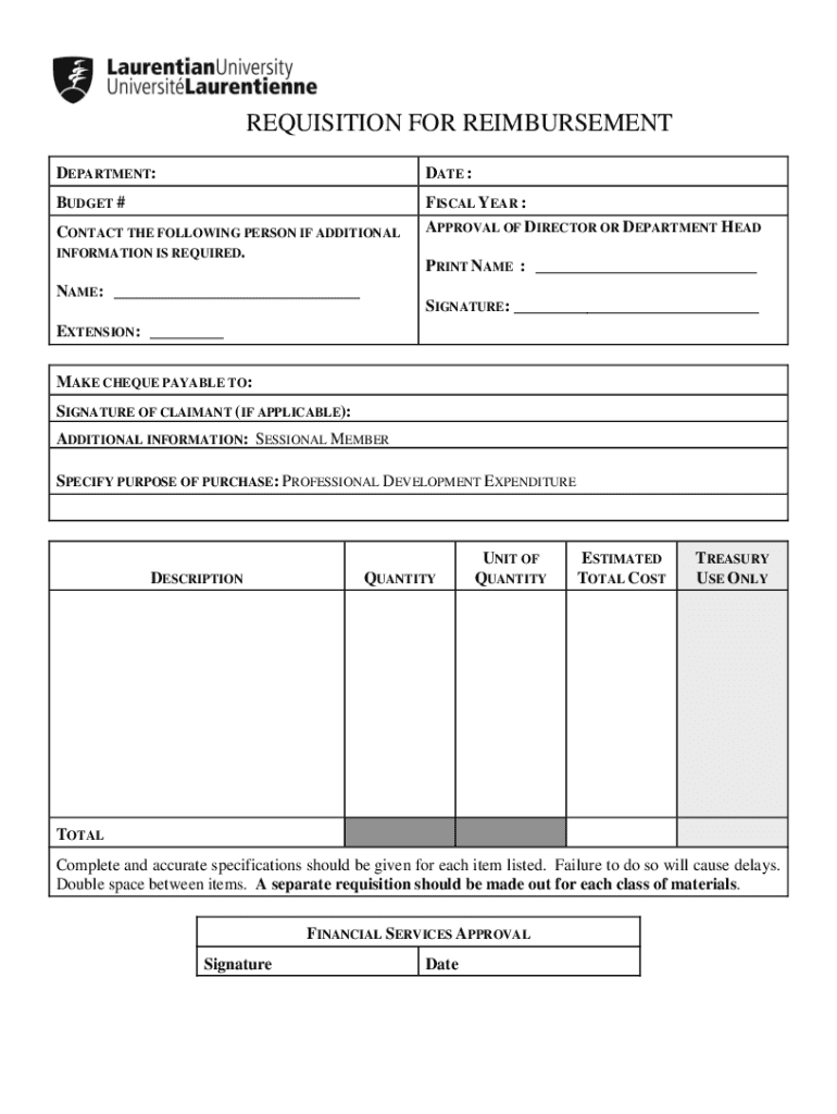 REQUISITION FOR REIMBURSEMENT DEPARTMENT:DATE :BUDGET #FISCAL YEAR : APPROVAL OF DIRECTOR OR DEPARTMENT RECONTACT THE FOLLOWING PERSON IF ADDITIONAL INFORMATION IS REQUIRED. NAME: PRINT NAME : SIGNATURE: