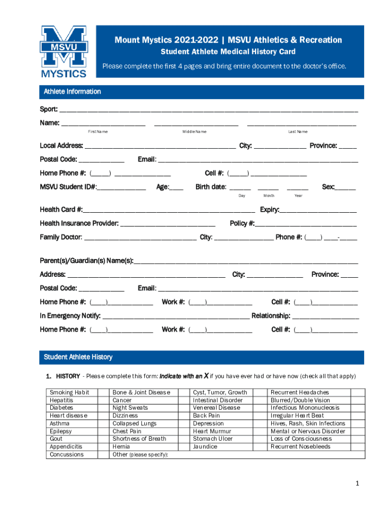 Mount Mystics 20212022 MSU Athletics & Recreation Student Athlete Medical History Card Please complete the first 4 pages and bring entire document to the doctors' office. Athlete Information Sport:
