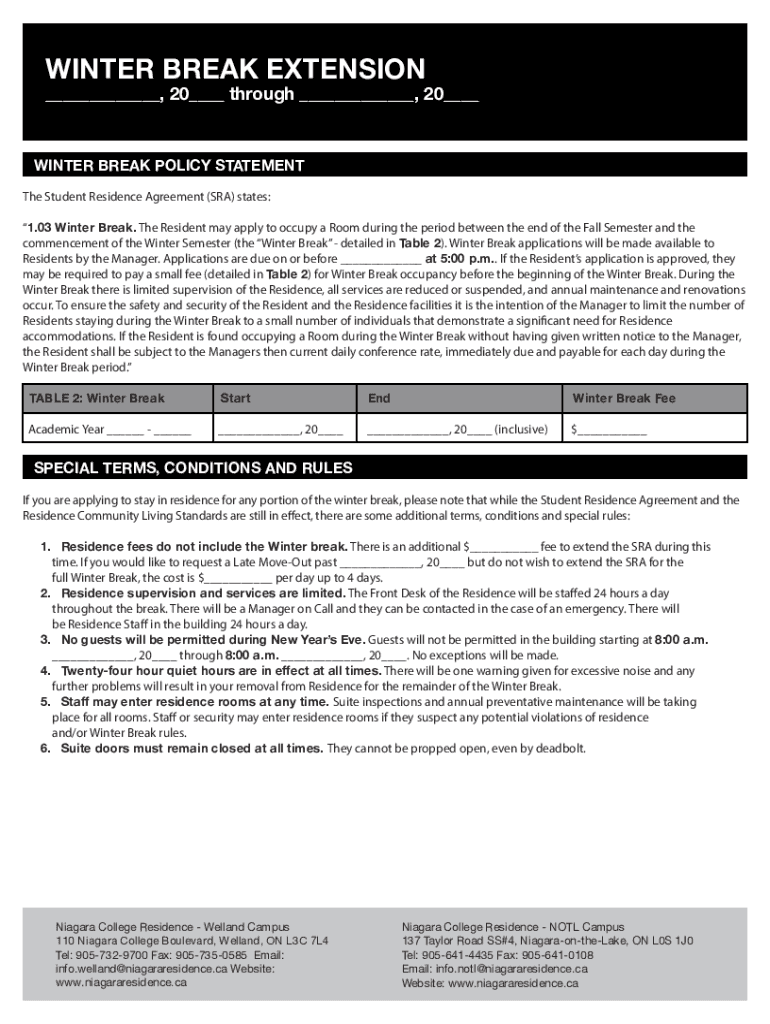 WINTER BREAK EXTENSION, 20 through, 20 WINTER BREAK POLICY STATEMENT The Student Residence Agreement (SRA) states: 1.03 Winter Break. The Resident may apply to occupy a Room during the period between