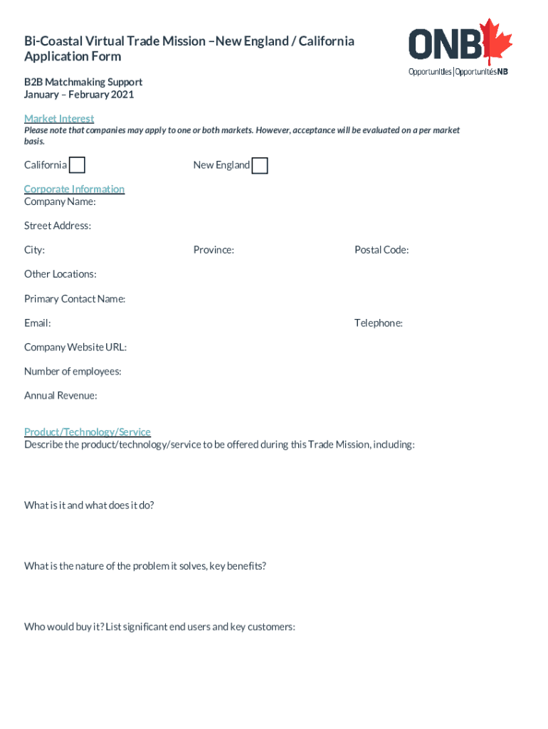 Coastal Virtual Trade Mission New England / California Application Form B2B Matchmaking Support January February 2021 Market Interest Please note that companies may apply to one or both markets. However,