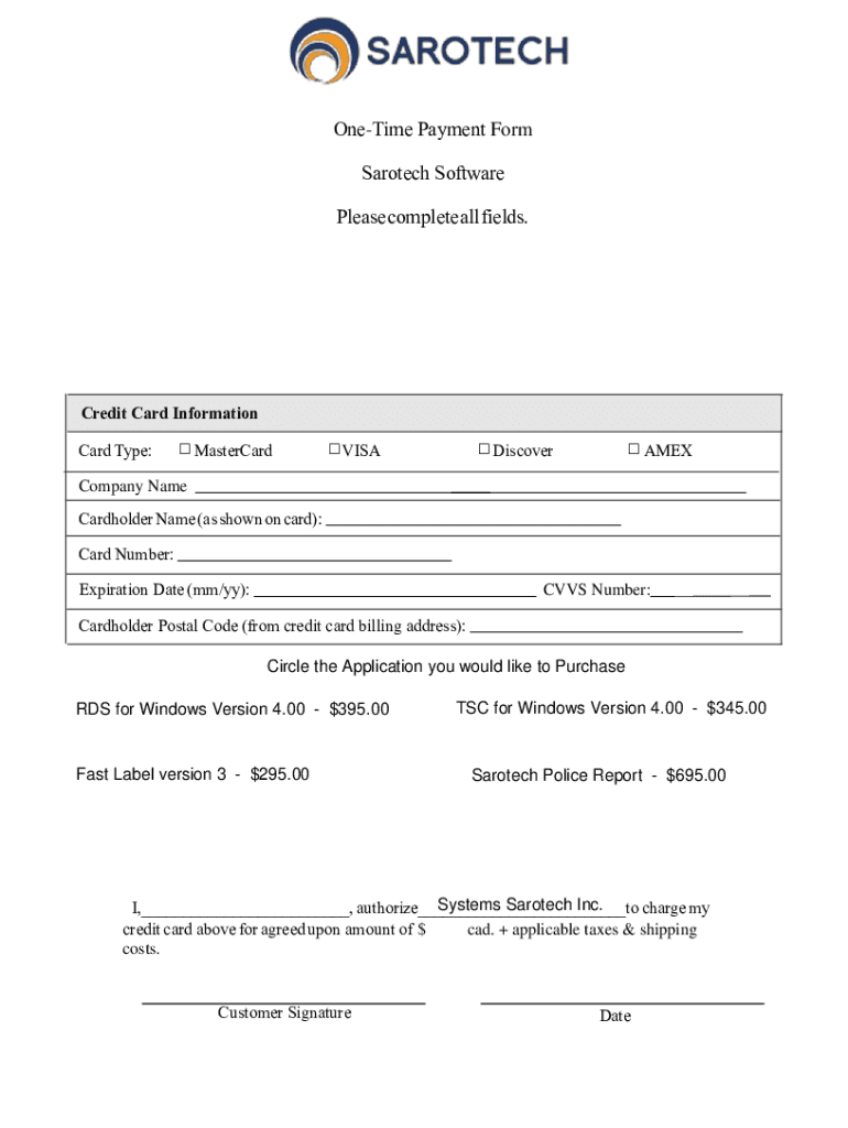 Onetime Payment Form Nanotech Software Please complete all fields. Credit Card Information Card Type: MasterCard VISA Discover Accompany Name Cardholder Name (as shown on card): Card Number: Expiration