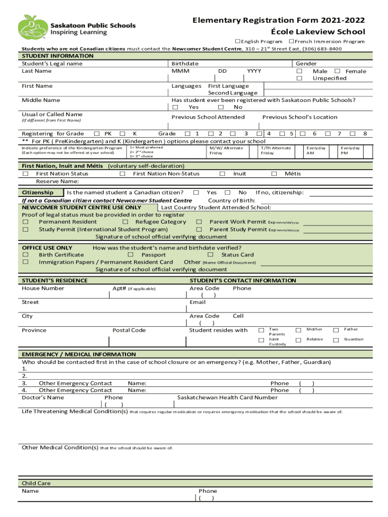 Elementary Registration Form 20212022 Cole Lake view School English Program French Immersion Program Students who are not Canadian citizens must contact the Newcomer Student Center, 310 21st Street