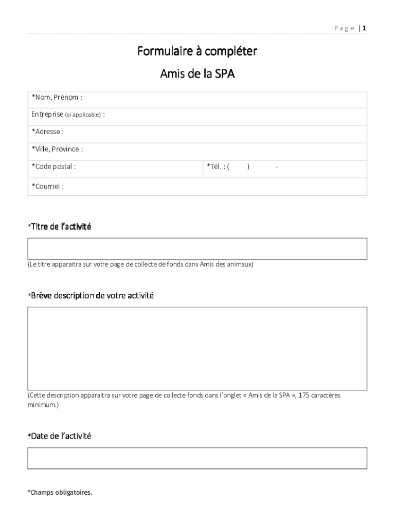 Page 1Formulaire computer AMIS DE la SPA *Not, Prom : Enterprise (is applicable) : *Address : *Villa, Province : *Code postal :*Tl. : ()*Courier :*Title DE activity(Le title apparatus SUR vote page