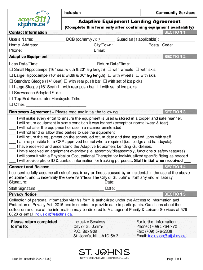 Get the free Adaptive Equipment Lending Agreement - m.stjohns.ca
