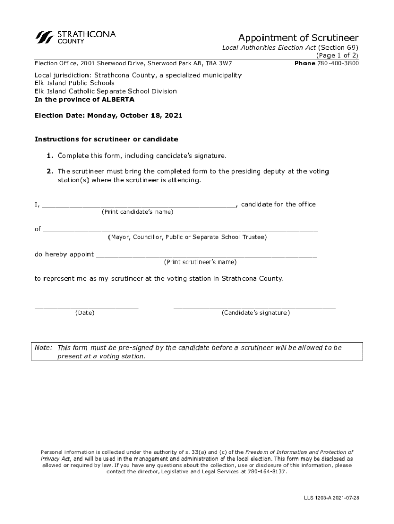 Appointment of ScrutineerLocal Authorities Election Act (Section 69) (Page 1 of 2)Election Office, 2001 Sherwood Drive, Sherwood Park AB, T8A 3W7Phone 7804003800Local jurisdiction: Stratton County,