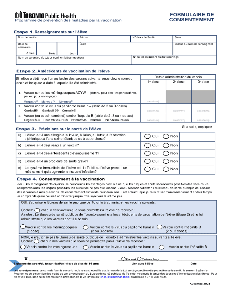 Le Formulaire de consentement à la vaccination est un document utilisé par les parents ou tuteurs légaux pour donner leur consentement à la vaccination des élèves en Ontario.