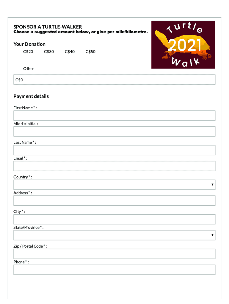 SPONSOR A TURTLEWALKERChoose a suggested amount below, or give per mile/kilometer. Your Donation C$20C$30Other C$0Payment details First Name * :Middle Initial :Last Name * :Email * :Country * :Address