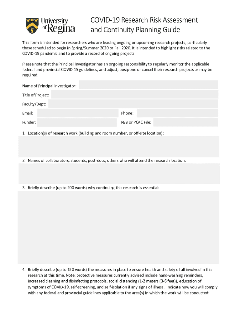 COVID19ResearchRiskAssessment and Continuity Planning Guide Thisformisintendedforresearcherswhoareleadingongoingorupcomingresearchprojects, particularly thosescheduledtobegininSpring/Summer2020orFall2020.