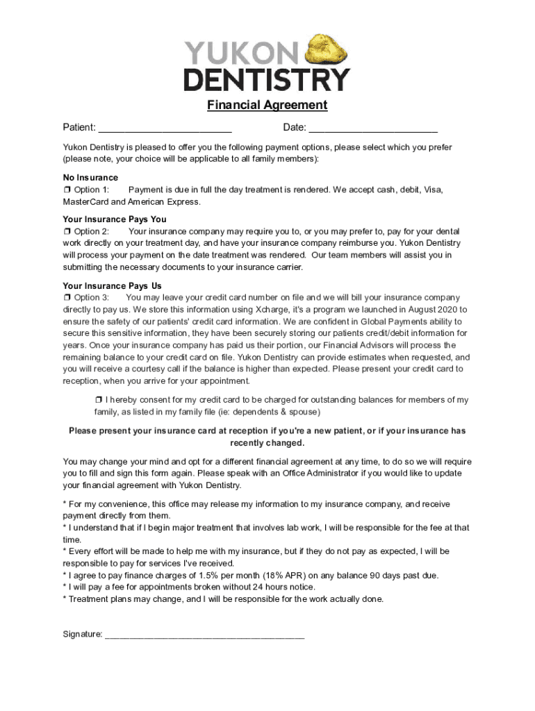 Financial Agreement Patient: Date: Yukon Dentistry is pleased to offer you the following payment options, please select which you prefer (please note, your choice will be applicable to all family