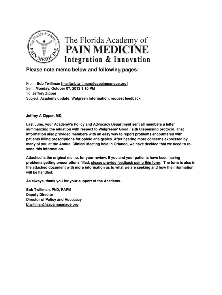 Please note memo below and following pages: From: Bob Tillman mail to:Tillman aapainmanage.org Sent: Monday, October 07, 2013 1:10 PM To: Jeffrey Zipper Subject: Academy update: Walgreen information,