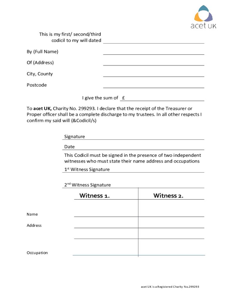 This is my first/ second/third codicil to my will dated By (Full Name) Of (Address) City, County Postcode I give the sum of To act UK, Charity No. 299293. I declare that the receipt of the Treasurer