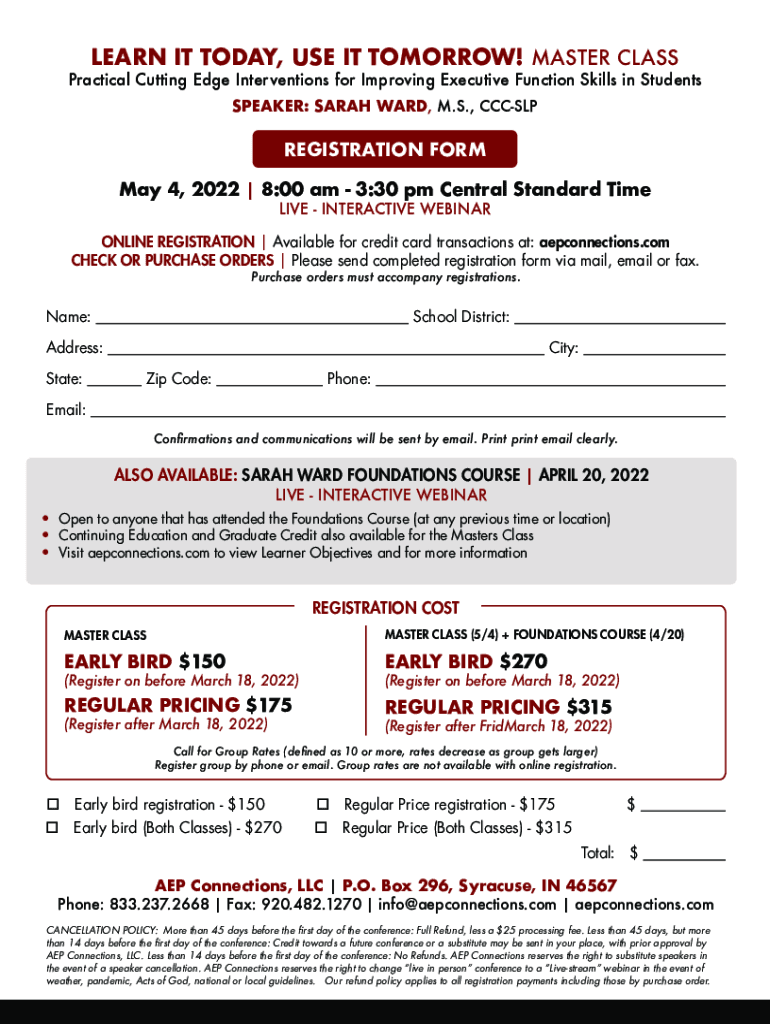 LEARN IT TODAY, USE IT TOMORROW! MASTER CLASSPractical Cutting Edge Interventions for Improving Executive Function Skills in Students SPEAKER: SARAH WARD, M.S., CCCSLPREGISTRATION FORM May 4, 2022