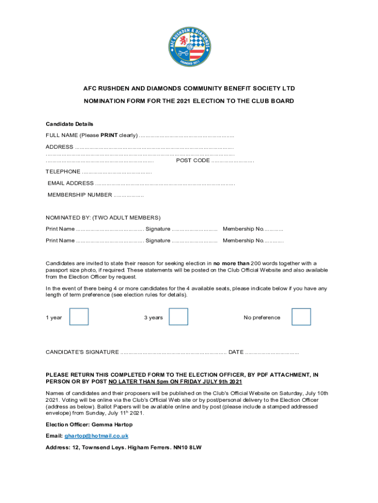 AFC RUSHED AND DIAMONDS COMMUNITY BENEFIT SOCIETY LTD NOMINATION FORM FOR THE 2021 ELECTION TO THE CLUB BOARDCandidate Details FULL NAME (Please PRINT clearly) ............................................................