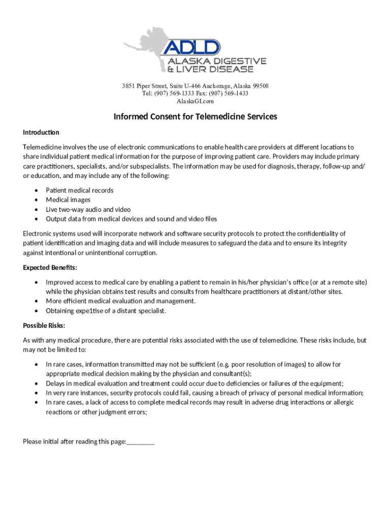 3851 Piper Street, Suite U466 Anchorage, Alaska 99508 Tel: (907) 5691333 Fax: (907) 5691433 Alaska GI.conformed Consent for Telemedicine Services Introduction Telemedicine involves the use of electronic
