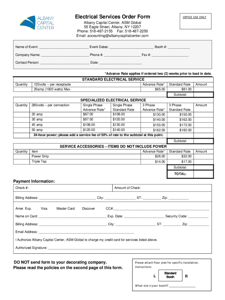 Electrical Services Order FormOFFICE USE ONLY Albany Capital Center, ASM Global 55 Eagle Street, Albany, NY 12207 Phone: 5184872155 Fax: 5184872250 Email: accounting albanycapitalcenter.com Name of