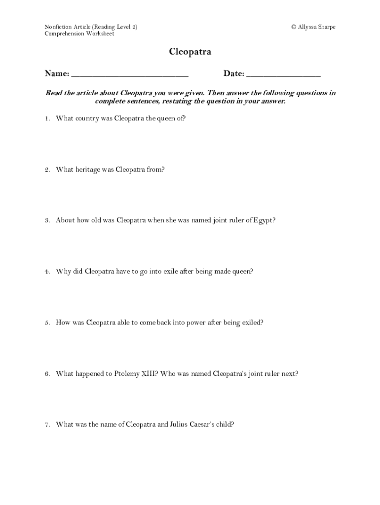 Nonfiction Article (Reading Level 2) Comprehension Worksheet Alyssa Sharpe Cleopatra Name: Date: Read the article about Cleopatra you were given. Then answer the following questions in complete sentences,