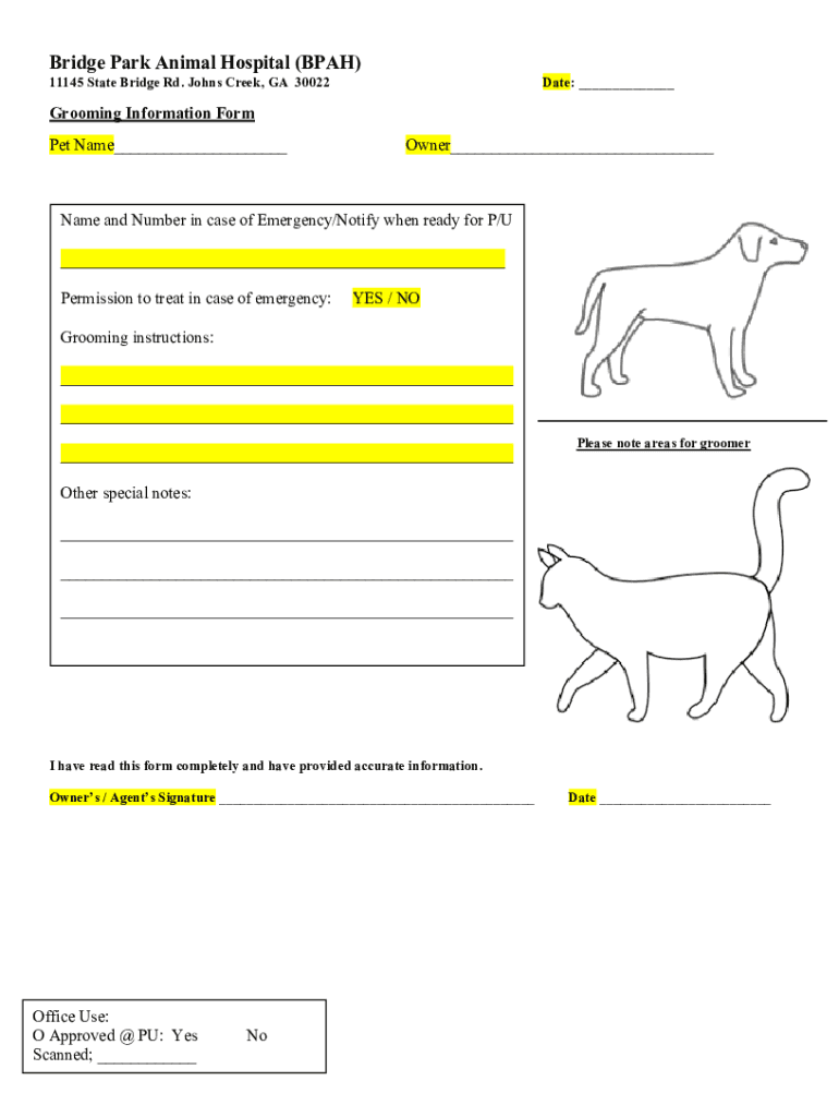 Bridge Park Animal Hospital (BPA) 11145 State Bridge Rd. Johns Creek, GA 30022Date: Grooming Information Form Pet Name Owner Name and Number in case of Emergency/Notify when ready for P/U Permission