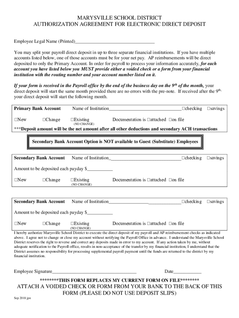 MARYSVILLE SCHOOL DISTRICT AUTHORIZATION AGREEMENT FOR ELECTRONIC DIRECT DEPOSIT Employee Legal Name (Printed) You may split your payroll direct deposit in up to three separate financial institutions.