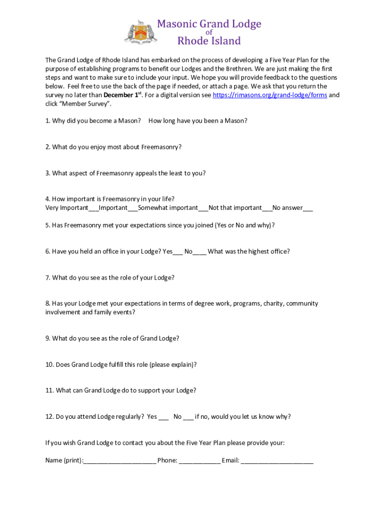 The Grand Lodge of Rhode Island has embarked on the process of developing a Five-Year Plan for the purpose of establishing programs to benefit our Lodges and the Brethren. We are just making the first