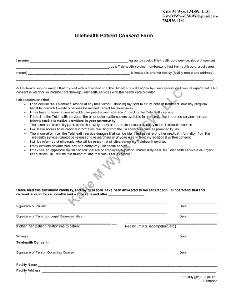 Katie M Wuss MSW, LLC KatieMWyssLMSW gmail.com 7349269189Telehealth Patient Consent Form Nebraska Telehealth Patient Consent Form I (name) agree to receive this health care service, (type of service),