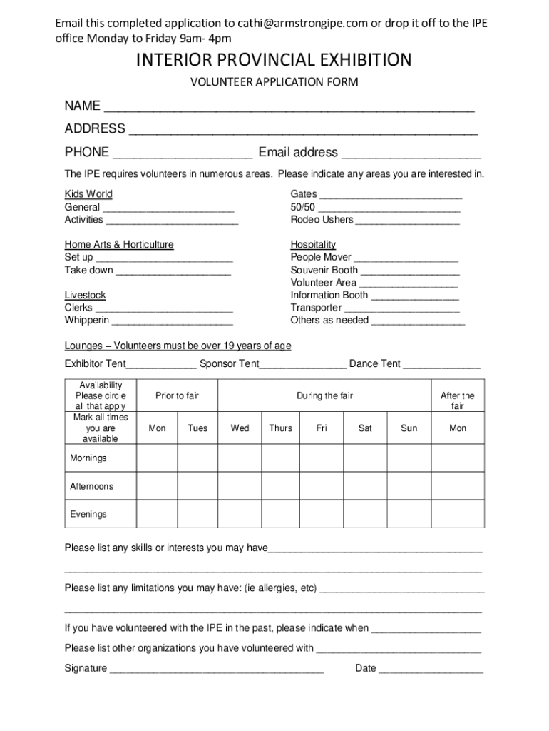 Email this completed application to Cathy armstrongipe.com or drop it off to the IPE office Monday to Friday 9am 4pmINTERIOR PROVINCIAL EXHIBITION VOLUNTEER APPLICATION FORM NAME ADDRESS PHONE Email