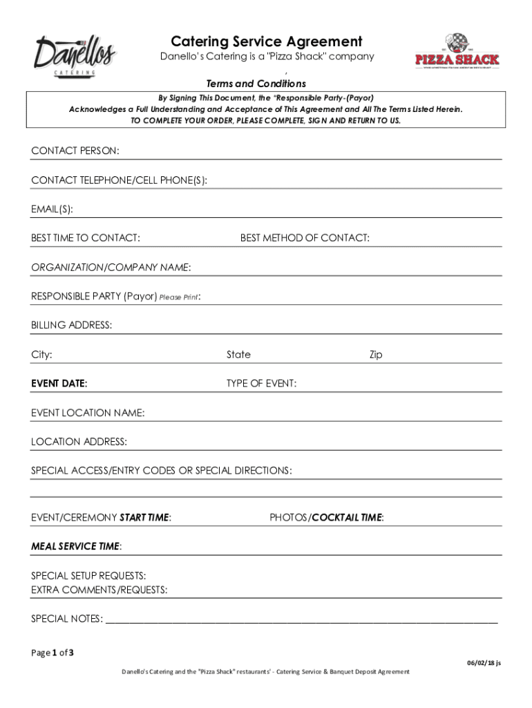 Catering Service Agreement Dallas Catering is a “Pizza Shack company, Terms and Conditions By Signing This Document, the Responsible Party(Mayor) Acknowledges a Full Understanding and Acceptance