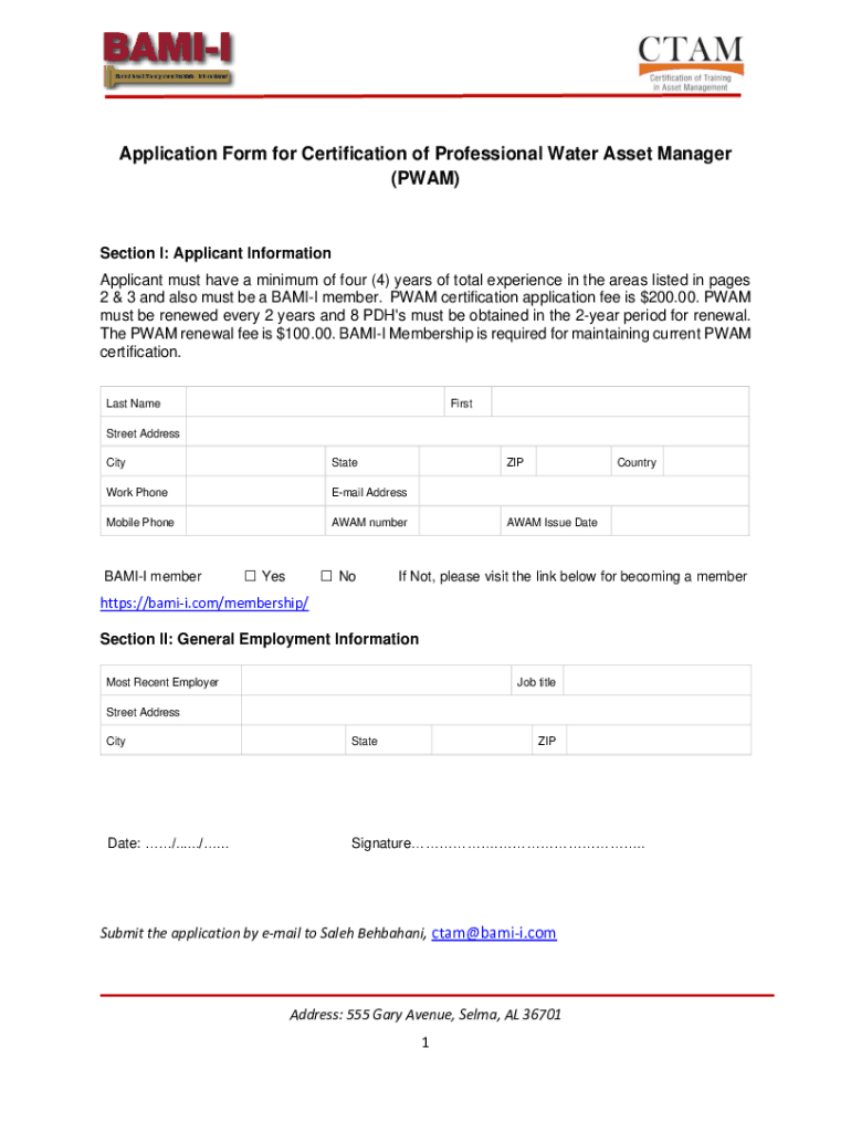 Application Form for Certification of Professional Water Asset Manager (PWAM)Section I: Applicant Information Applicant must have a minimum of four (4) years of total experience in the areas listed