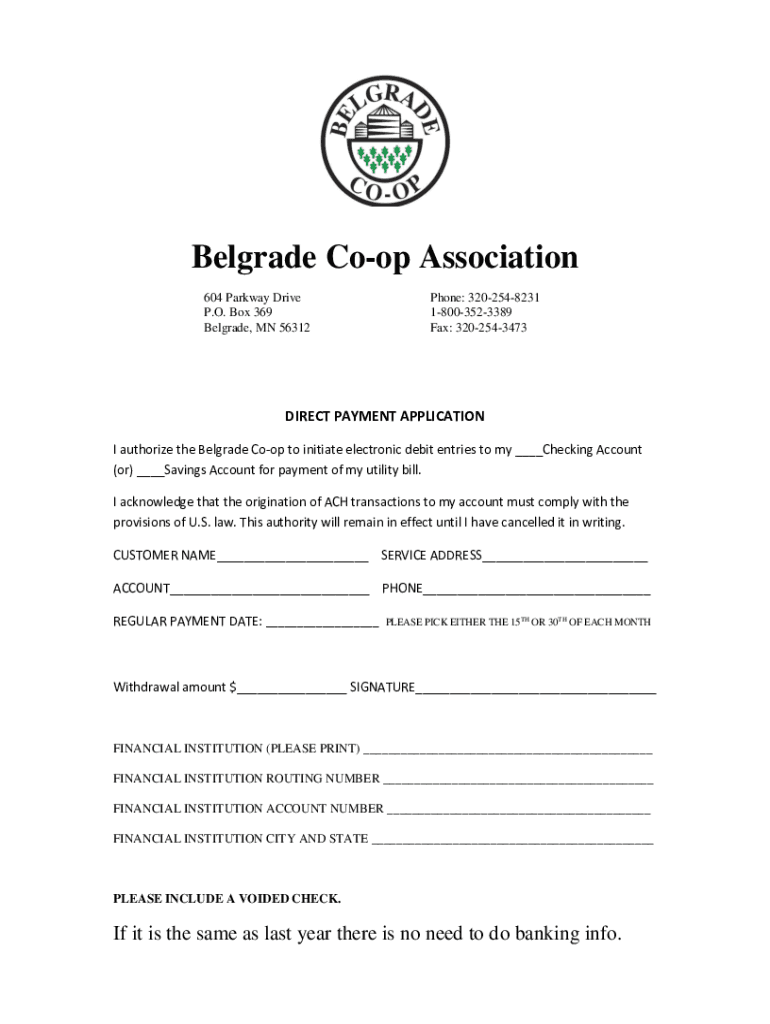 Belgrade Coop Association 604 Parkway Drive P.O. Box 369 Belgrade, MN 56312Phone: 3202548231 18003523389 Fax: 3202543473DIRECT PAYMENT APPLICATION I authorize the Belgrade Coop to initiate electronic
