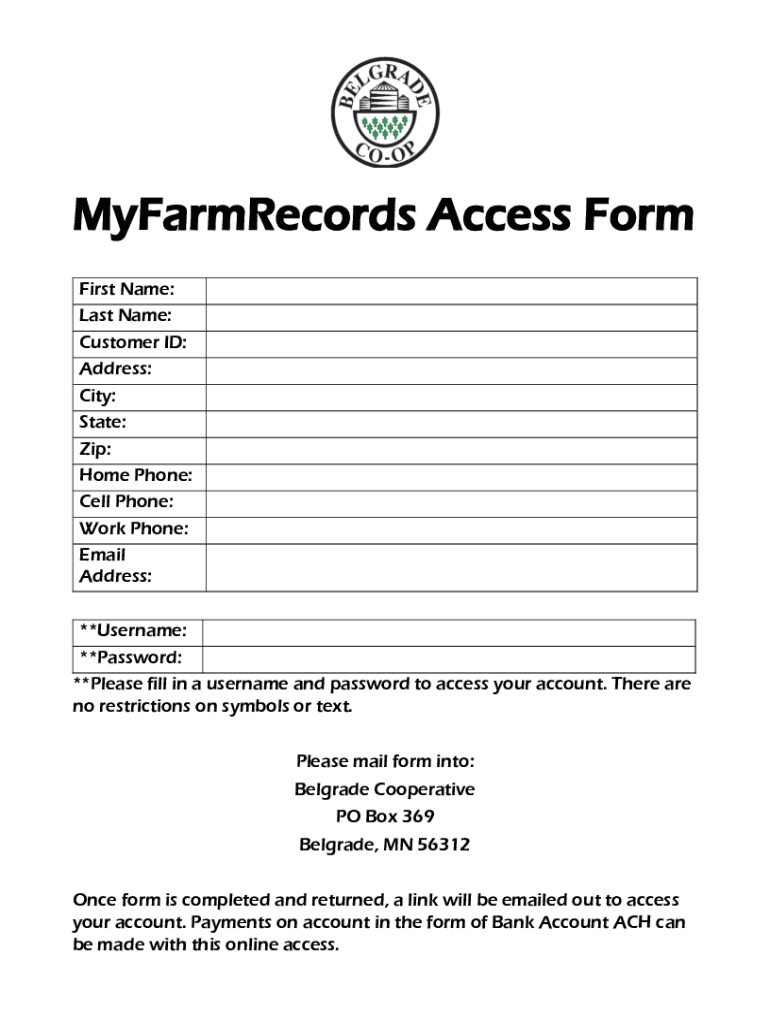 MyFarmRecords Access Form First Name: Last Name: Customer ID: Address: City: State: Zip: Home Phone: Cell Phone: Work Phone: Email Address: **Username: **Password: **Please fill in a username and