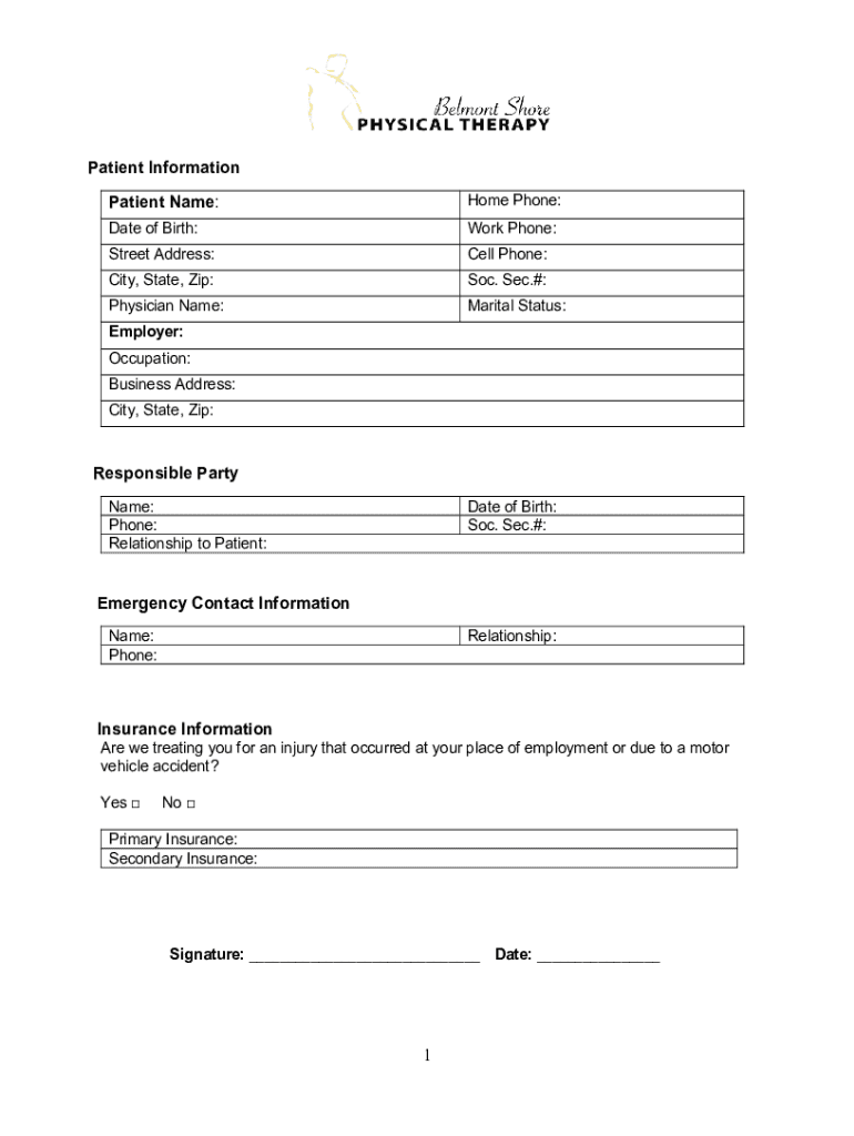 Patient Information Patient Name:Home Phone:Date of Birth:Work Phone:Street Address:Cell Phone:City, State, Zip:Soc. Sec.#:Physician Name:Marital Status:Employer: Occupation: Business Address: City,