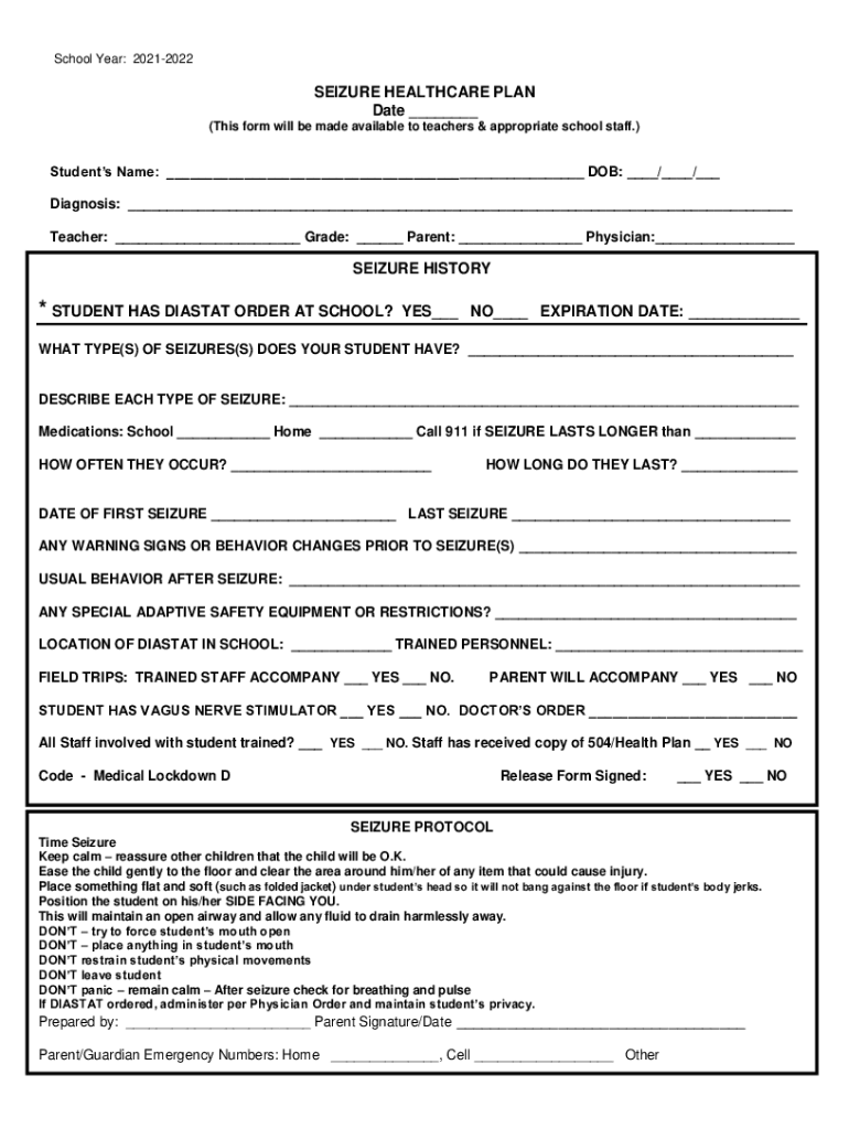 School Year: 20212022SEIZURE HEALTHCARE PLAN Date (This form will be made available to teachers & appropriate school staff.) Students Name: DOB: / / Diagnosis: Teacher: Grade: Parent: Physician: SEIZURE