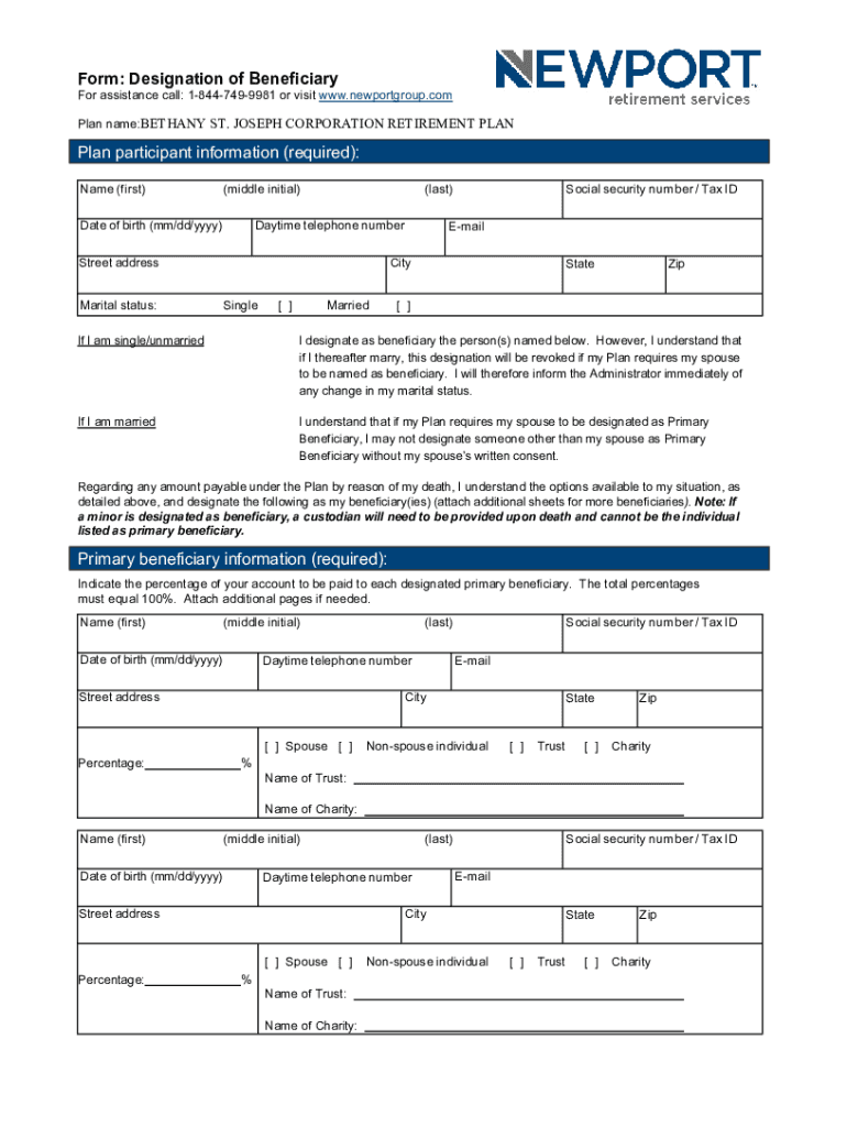 Form: Designation of Beneficiary For assistance call: 18447499981 or visit www.newportgroup.com Plan name:BETHANY ST. JOSEPH CORPORATION RETIREMENT Lankan participant information (required): Name