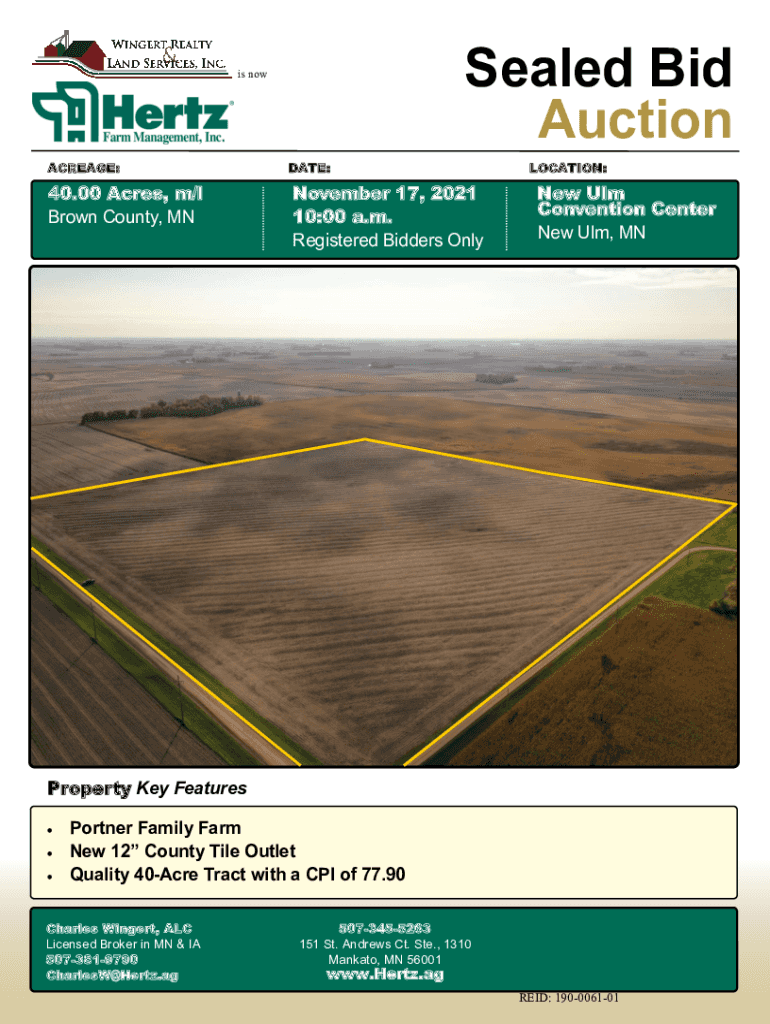 Sealed Bid Auctions acreage:40.00 Acres, m/l Brown County, MANDATE:November 17, 2021 10:00 a.m. Registered Bidders Allocation:New Ulm Convention Center New Ulm, Property Key Features Partner Family