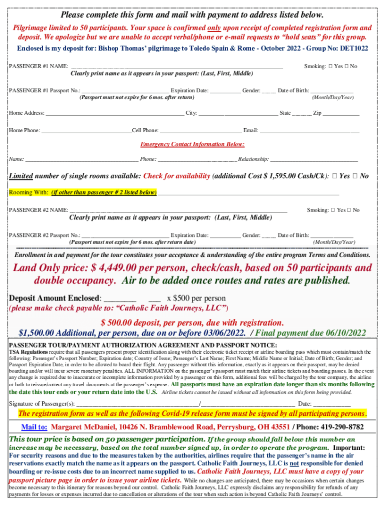 Please complete this form and mail with payment to address listed below. Pilgrimage limited to 50 participants. Your space is confirmed only upon receipt of completed registration form and deposit.